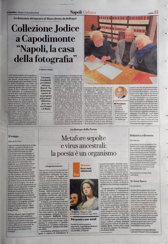Un ringraziamento a Eugenio Lucrezi che su la Repubblica di Napoli, nella sua rubrica “La Bottega della Poesia”, del 17 dicembre 2022 accoglie una mia poesia tratta da “Linea di cattedra” (Samuele editore, 2021).