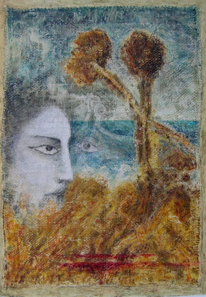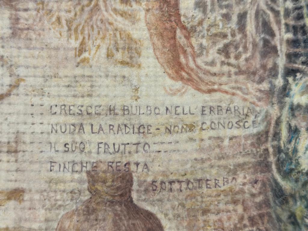 (acrilico su tavola 63 cm x 106) il bulbo, la terra e la radice, il giardino spoglio da cui si erge il fiore. Ciò che sotto la linea apparentemnte punge e soccombe trova il coraggio di ergersi sopra l’orizzonte e spuntare. Come la radice dal bulbo, come il virgulto che spacca il seme. Emily Dickinson scriveva ” al cielo sempre più tende – invece / il coraggioso rovo” come si legge ai piedi del secondo quadro.