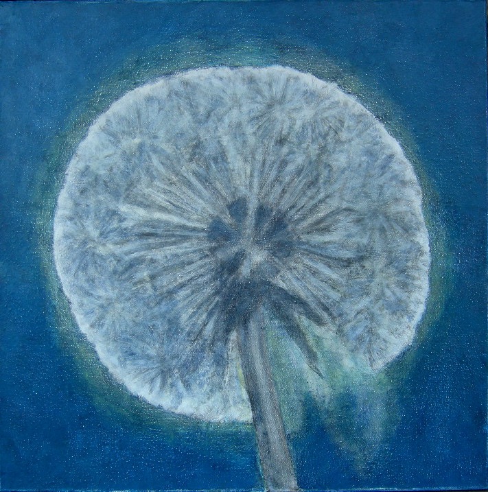 (acrilico su tela 60 x 60 cm) I soffioni, i fuochi d’artificio, le stelle… la corolla che cede al soffio, al vento, libera il desiderio nella potenza dell’esplosione; mentre il colore indaga l’intensità dell’azzurro, la geometria sottesa al fiore.